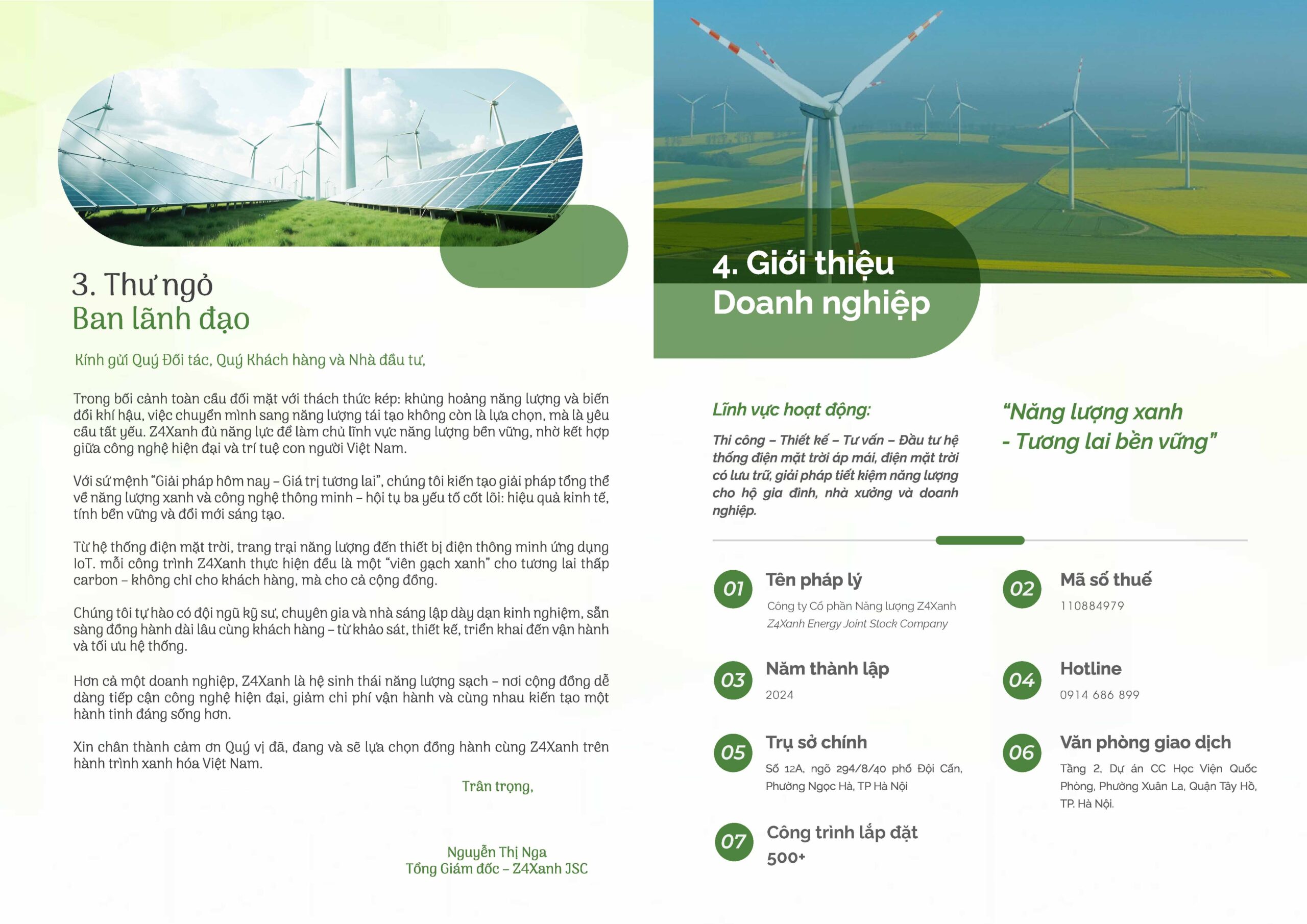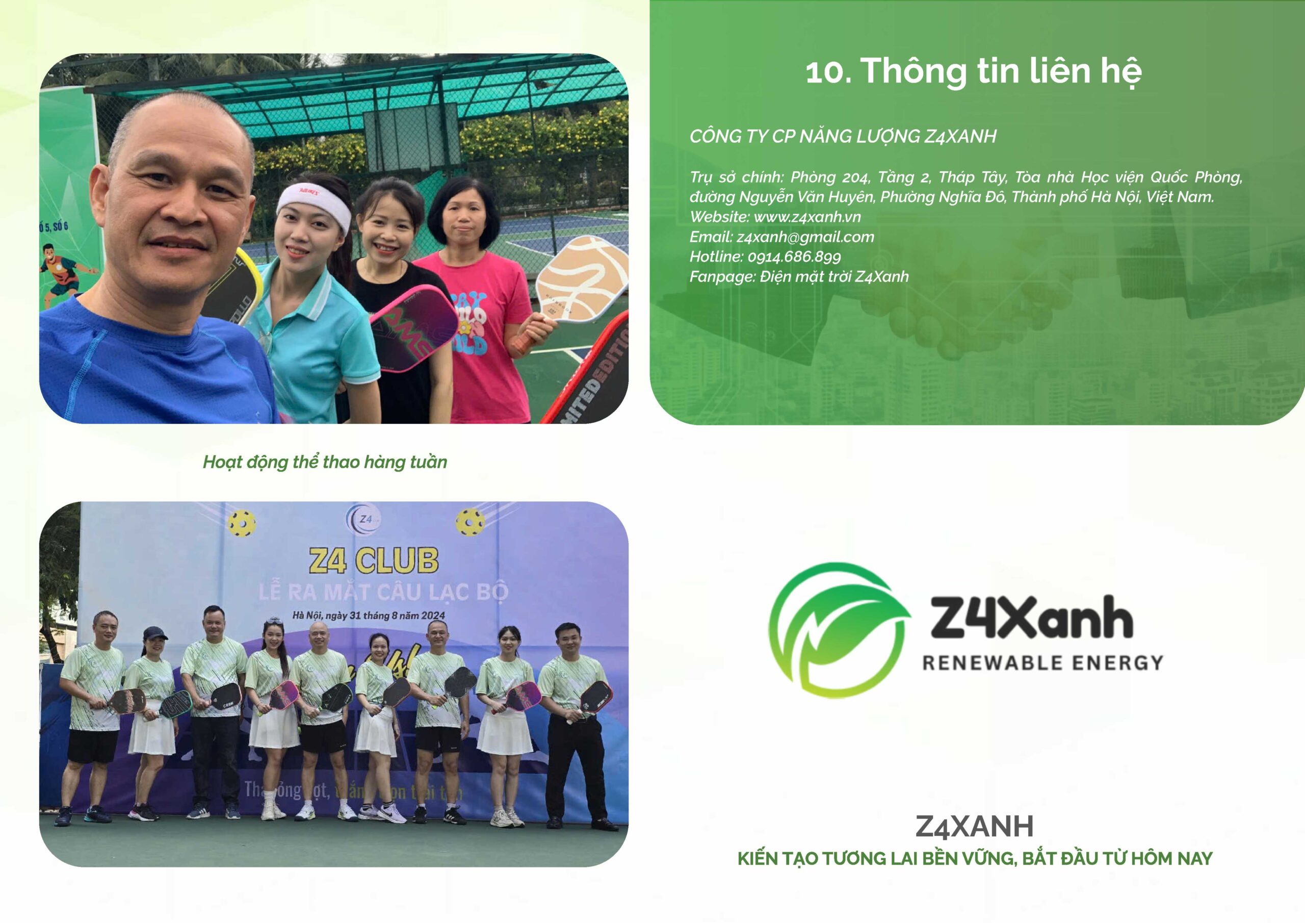 Công Ty Cổ Phần Năng Lượng Z4XANH trân trọng giới thiệu đến Quý khách hàng hồ sơ năng lực – tài liệu thể hiện đầy đủ năng lực, kinh nghiệm và các dự án tiêu biểu trong lĩnh vực tư vấn, thiết kế và lắp đặt hệ thống điện mặt trời. Với đội ngũ kỹ sư chuyên môn cao, quy trình chuyên nghiệp và nhiều công trình đã triển khai thành công, Z4XANH cam kết mang đến giải pháp tiết kiệm – bền vững – hiệu quả cho doanh nghiệp và hộ gia đình. Kính mời Quý khách tham khảo để hiểu rõ hơn về giá trị và dịch vụ mà chúng tôi cung cấp.
